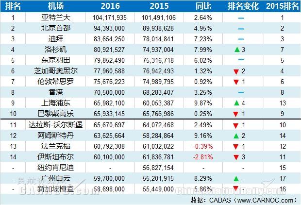 亞特蘭大、北京首都、迪拜國際機(jī)場繼續(xù)領(lǐng)跑前三甲。