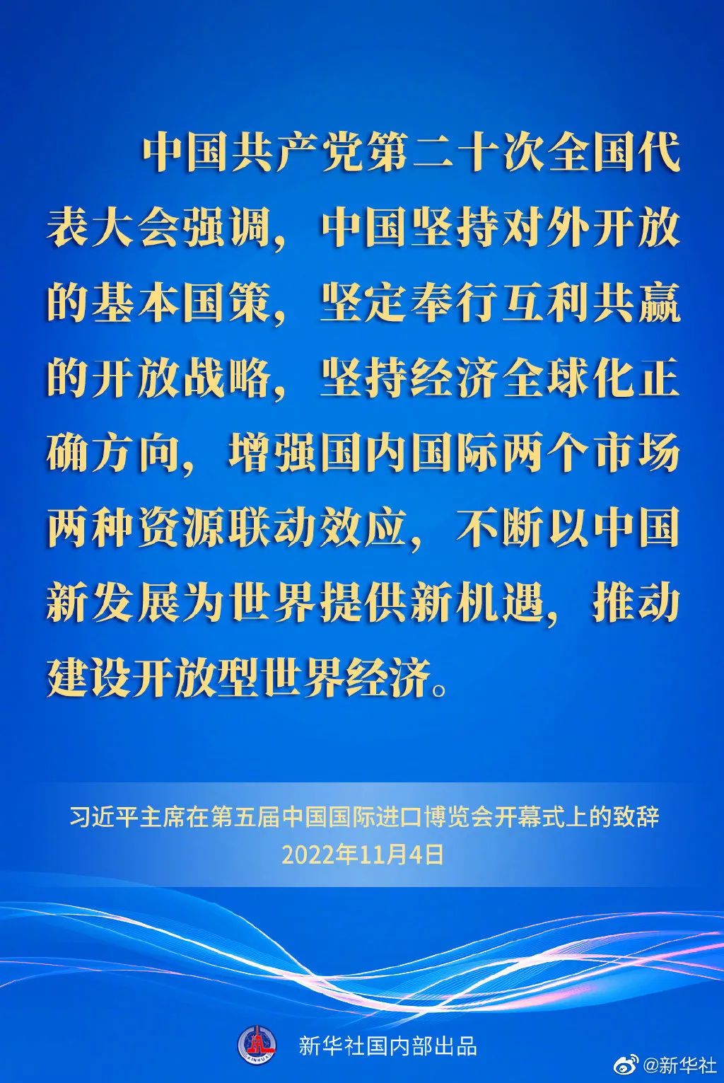 習(xí)近平指出,中國(guó)共產(chǎn)黨第二十次全國(guó)代表大會(huì)強(qiáng)調(diào),中國(guó)堅(jiān)持對(duì)外開(kāi)放的基本國(guó)策,堅(jiān)定奉行互利共贏的開(kāi)放戰(zhàn)略,堅(jiān)持經(jīng)濟(jì)全球化正確方向,增強(qiáng)國(guó)內(nèi)國(guó)際兩個(gè)市場(chǎng)兩種資源聯(lián)動(dòng)效應(yīng),不斷以中國(guó)新發(fā)展為世界提供新機(jī)遇,推動(dòng)建設(shè)開(kāi)放型世界經(jīng)濟(jì)。