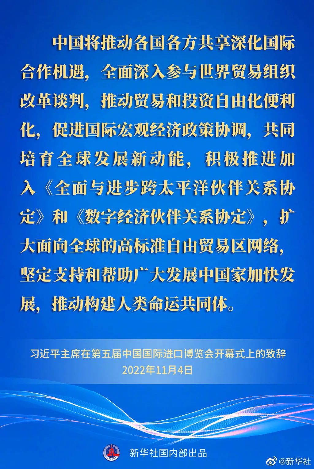 ——中國(guó)將推動(dòng)各國(guó)各方共享深化國(guó)際合作機(jī)遇,全面深入?yún)⑴c世界貿(mào)易組織改革談判,推動(dòng)貿(mào)易和投資自由化便利化,促進(jìn)國(guó)際宏觀經(jīng)濟(jì)政策協(xié)調(diào),共同培育全球發(fā)展新動(dòng)能,積極推進(jìn)加入《全面與進(jìn)步跨太平洋伙伴關(guān)系協(xié)定》和《數(shù)字經(jīng)濟(jì)伙伴關(guān)系協(xié)定》,擴(kuò)大面向全球的高標(biāo)準(zhǔn)自由貿(mào)易區(qū)網(wǎng)絡(luò),堅(jiān)定支持和幫助廣大發(fā)展中國(guó)家加快發(fā)展,推動(dòng)構(gòu)建人類(lèi)命運(yùn)共同體。