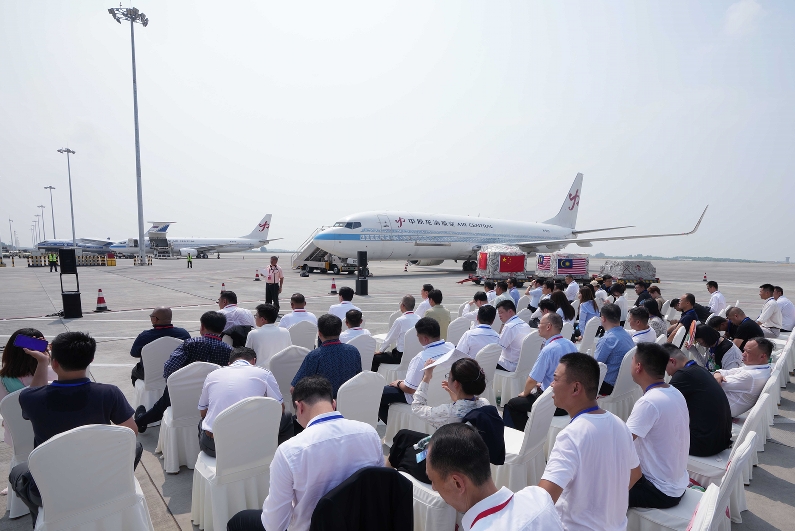 8月25日上午,吉隆坡-鄭州鮮食榴蓮首航接機(jī)儀式在鄭州機(jī)場(chǎng)舉行,馬來(lái)西亞首批鮮食榴蓮進(jìn)入中國(guó)市場(chǎng),中馬航空貨運(yùn)樞紐項(xiàng)目加速推進(jìn)。中豫航空集團(tuán)黨委書(shū)記、董事長(zhǎng)張明超,總經(jīng)理、黨委副書(shū)記、副董事長(zhǎng)柳建民;馬來(lái)西亞駐華大使館工作人員,馬來(lái)西亞榴蓮廠商公會(huì)代表和榴蓮貿(mào)易供應(yīng)鏈企業(yè)代表參加了儀式。