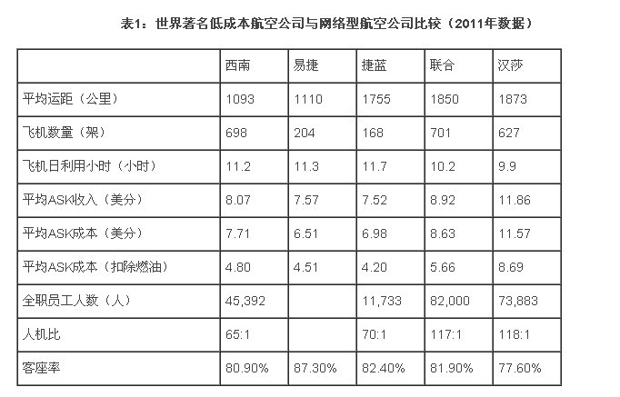 為了便于比較,本文選擇了我們普遍認可的低成本航空公司與較為熟悉的網(wǎng)絡型航空公司2011年的報表數(shù)據(jù),分別從平均運距、機隊規(guī)模、飛機日利用率、平均ASK收入與成本、以及客座率與人機比等項目進行比較(如表1)。